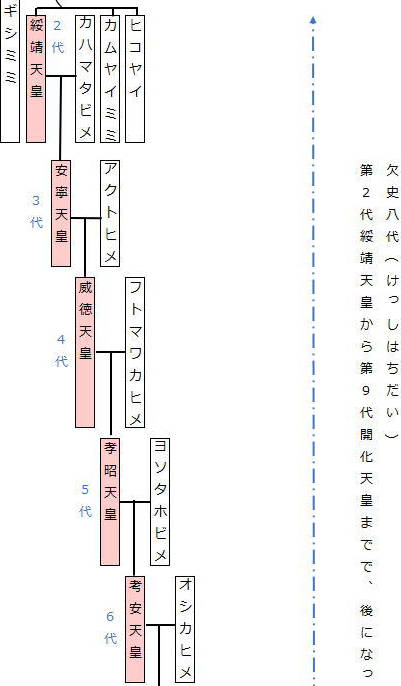 欠史八代(けっしはちだい)というのは、『古事記』や『日本書紀』にでてくる第2代綏靖天皇から第9代開化天皇までで、後になって創作された存在という見解が有力