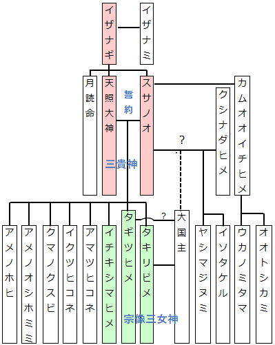 アマテラスがスサノオの長い剣を噛み砕いて息を吹き出すと、三神の女神が生まれた。(