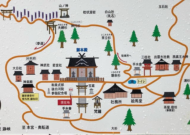 夫婦円満:境内の「夫婦杉」は二又に枝が分かれた杉で、夫婦で訪れてより良い夫婦仲を願うと、ご利益があると言われています。