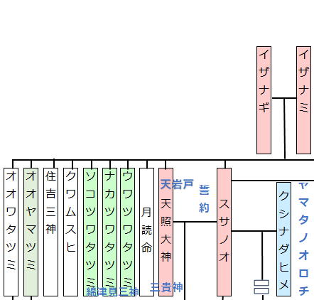 - 大海神=大綿津見神:海そのものを司る神。伊邪那岐命と伊邪那美命の子として生まれた。