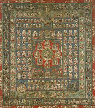 | 曼荼羅 | 密教の教義を表した曼荼羅で、大日如来を中心とする「胎蔵界」と「金剛界」の2つを組み合わせたものです。両界曼荼羅とも呼ばれます。 大日如来を主尊とし、密教の諸尊を2つの体系に統合して構成する正純密教の説く宇宙観を象徴的に表わすものとして最も重視されてきた胎蔵界は12院、金剛界は9会から成る 胎蔵界は慈悲の広がり、金剛界は悟りへの道筋を表すとされる 宇宙に太陽と月があるように、金剛界と胎蔵界の二つの曼荼羅があることによって、一つの世界が表される 寺院の堂内で東西に向き合うように安置され、その間で修法と呼ばれる密教の儀式を行うことによって、仏と一体となることを目指します。 |