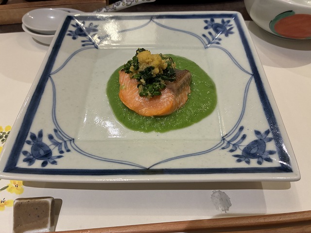 ・鱒の菜種焼き うぐいすソース